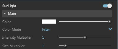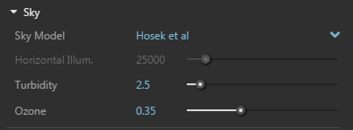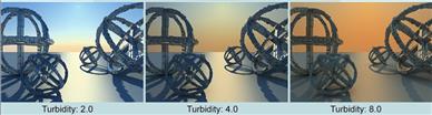 – Turbidity: Xác định lượng bụi trong không khí và ảnh hưởng đến màu sắc của mặt trời và bầu trời . Các giá trị nhỏ hơn tạo ra bầu trời trong xanh và mặt trời giống như ở các vùng nông thôn , trong khi các giá trị lớn hơn làm cho chúng màu vàng và cam như trong bầu không khí của thành phố lớn .